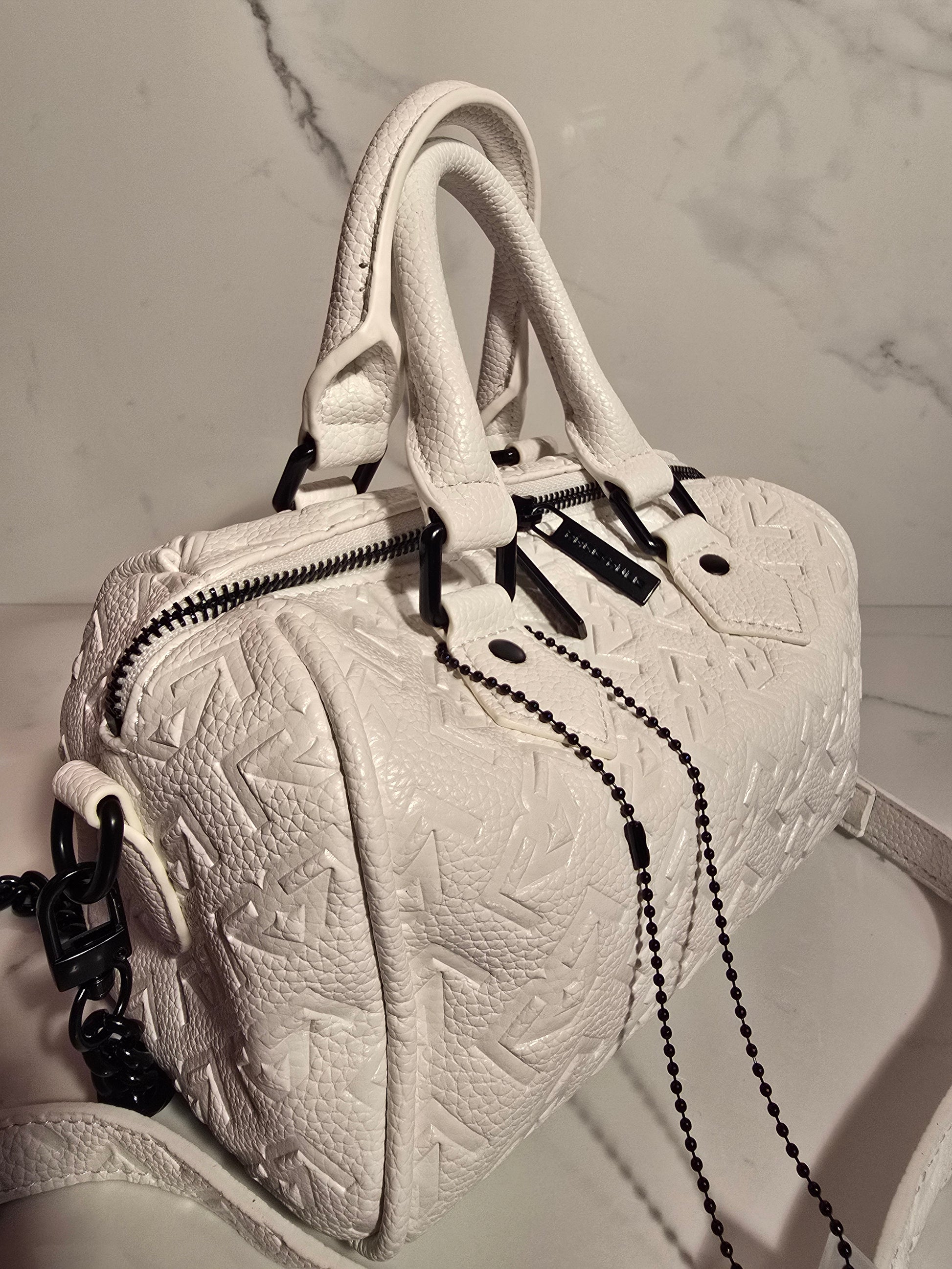 The RAGE&RULE Boston Bag is the perfect Bag. Modern inspired, edgy and sexy. Signature Monogram embossed Vegan Leather for durability and water resistant. Black hardware and red satin lining bring all the rage.